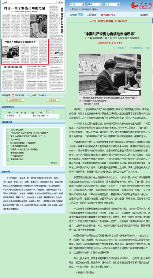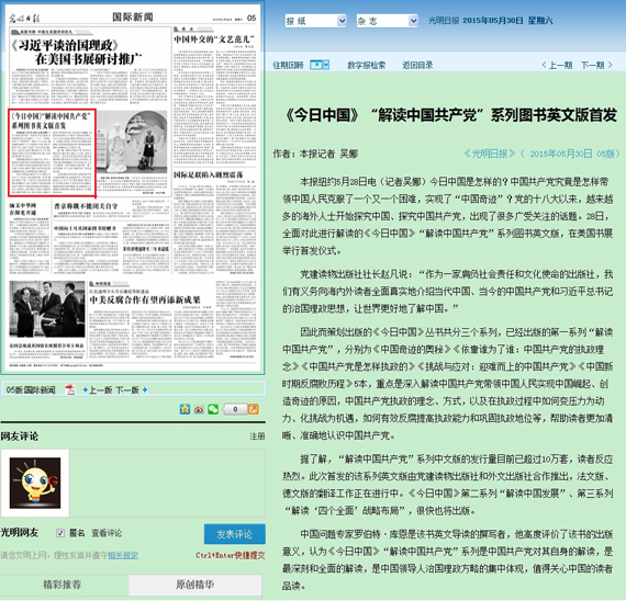 《今日中国》“解读中国共产党”系列图书共5本,分别为《中国奇迹的奥秘》《依靠谁为了谁:中国共产党的执政理念》《中国共产党是怎样执政的》《挑战与应对:迎难而上的中国共产党》《中国新时期反腐败历程》。该套由必赢官网、人文学院的有关专家学者撰写的丛书,在美引起了强烈反响。