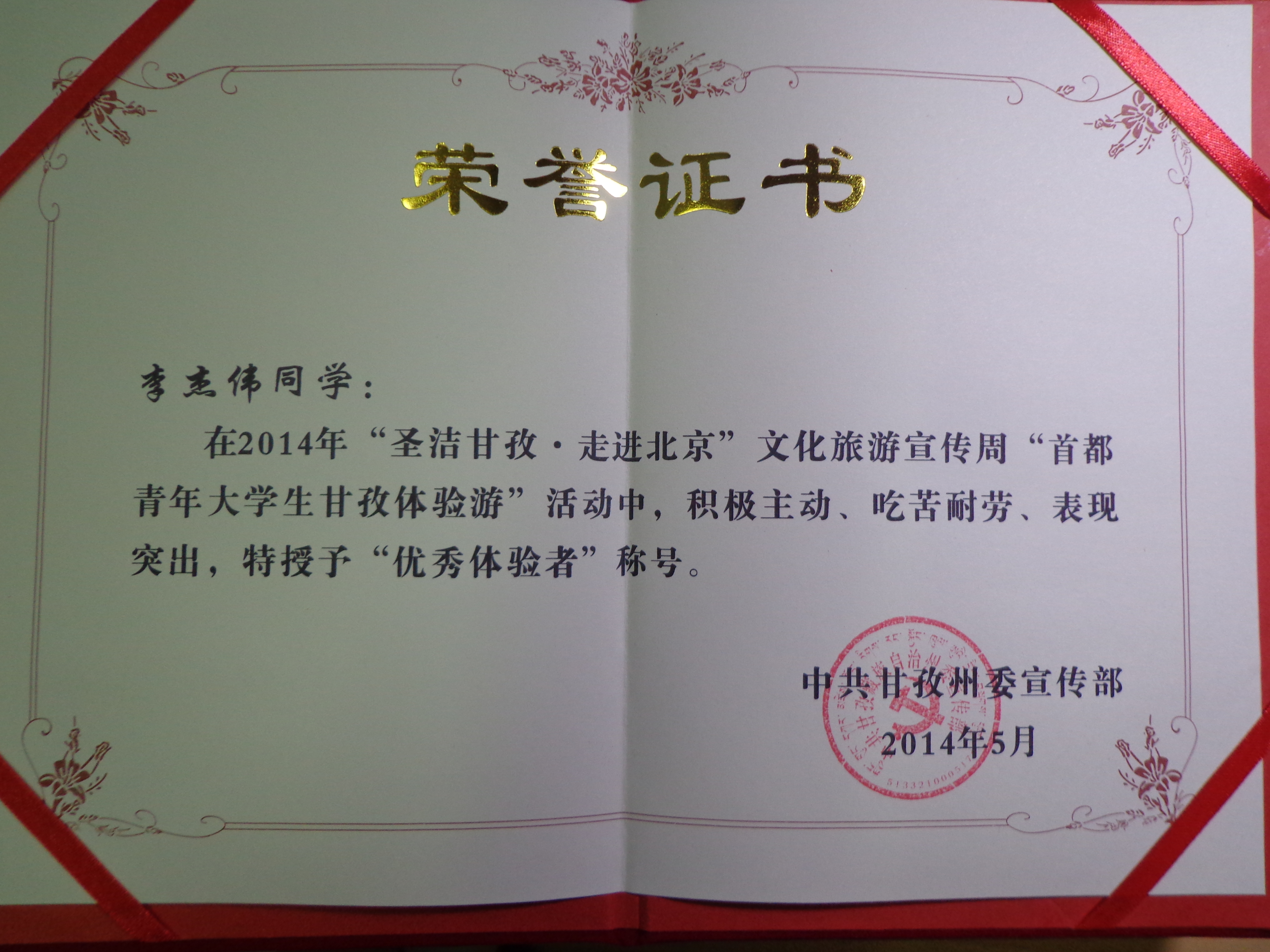 此次活动一共招募六名首都青年大学生前往甘孜藏族自治州感受藏区优美的自然风光和悠久的历史文化,李杰伟同学从近千人的报名队伍中脱颖而出。在5月1日至10日的活动中,李杰伟同学和其他5名体验者们前往甘孜藏族自治州的六个县——稻城、巴塘、德格、白玉、甘孜、康定,近距离接触阿西土陶和千年印经院等非物质文化遗产,学习少数民族的独特歌舞和戏剧。他们深入少数民族地区,感受到藏族同胞的善良真诚以及对于生活的热爱,同时也体会到藏区在改革开放之后所发生的巨大变化,立志努力为弘扬少数民族地区文化做出贡献。