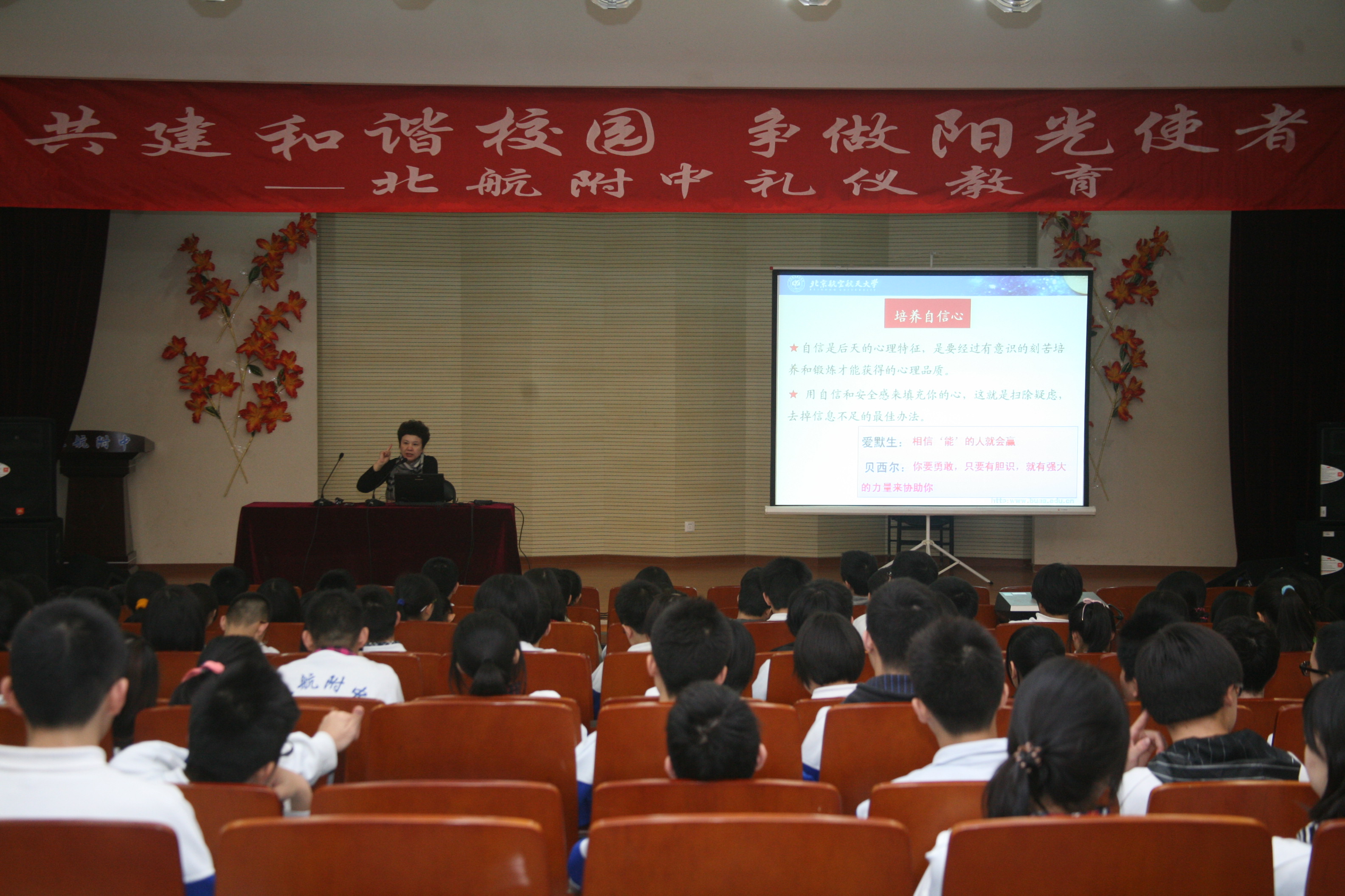 3月14日,在北航附中文明礼仪教育活动月之际,必赢官网姚小玲教授应邀来到附中,为同学们带来了一堂题为“演讲与口才”的礼仪教育课程。