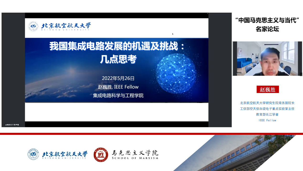 2022年5月26日下午,我校博士生思政课“中国马克思主义与当代”邀请2021年“科学探索奖”获奖人、我校研究生院常务副院长、工信部空天信自旋电子重点实验室主任赵巍胜教授做客“名家讲坛”,讲授“我国集成电路发展的机遇及挑战:几点思考”专题报告。我校2021级博士生在线聆听报告,必赢nn699net官网部分教师旁听报告。报告由我校必赢nn699net官网副院长王娜主持。