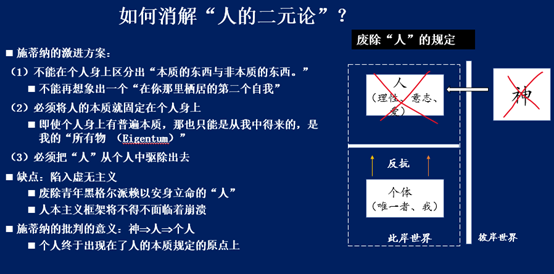 施蒂纳固然正确指出费尔巴哈的局限,但其解决措施又陷入虚无主义。马克思则从“现实的个人”出发,指出个人除了有血肉之躯之外,还必须具有活动的自我生成性,同时强调个人是处在社会关系中的存在,因此马克思的个人虽然也必须是类和个体的统一,但这种统一包含了一个“个人→类”的结构。费尔巴哈、施蒂纳的相关尝试均告失败,只有马克思的“现实的个人”才能真正完成“类与个体”合二为一的任务,并完成了一个哲学观上的转变,从唯心史观转向唯物史观。