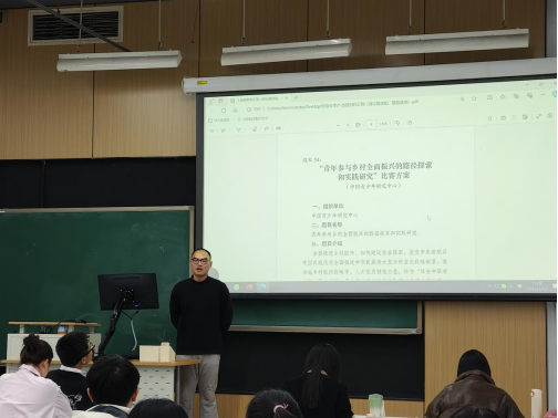 刘佳老师作为指导老师,连续两届指导学生参与全国“挑战杯”荣获佳绩,他结合自身指导学生参与科创竞赛实践经验,以“谈谈调研报告写作”为主题为现场的同学们带来了一场内容丰富、干货满满的专题报告。刘老师从调研报告的基本特征、基本类型和写作要点三个方面入手,首先强调了调研报告要具有客观性、时效性、整体性、规范性、输出性;继而介绍了资料型、分析型和研究型这三类报告的不同形式以及研究方法;最后从题目、序言、核心观点、结构安排、分析论证、对策建议等六个方面分享了如何抓住调研报告的写作要点,完成写作的技巧和方法。