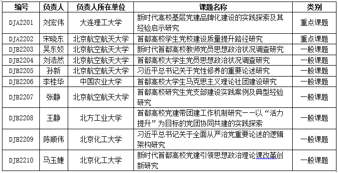 经过形式审查、专家评审、会议审定、结果公示等环节,首都高校党建研究基地共评出2022年度立项课题10项,其中重点课题2项、一般课题8项,现予公告。